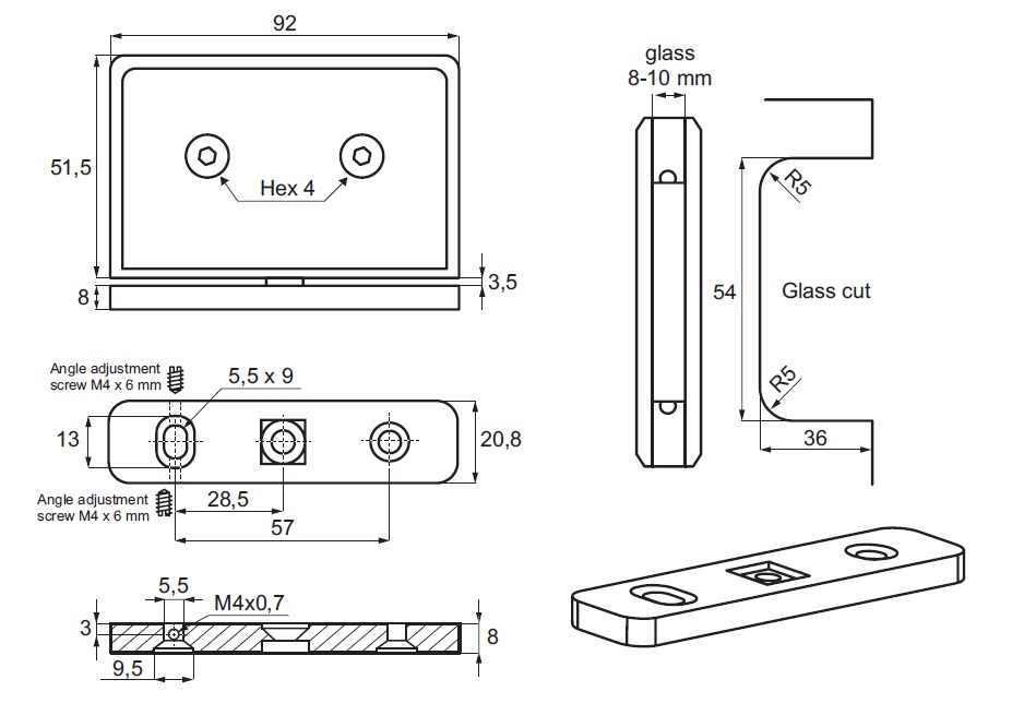 Shower Pivot Hinge "Lodz II", Floor/Glass,SS-Look,51,5x92x21 mm, With Adjustable Base, Brass Material, Incl. Gaskets, Screws & Templates, Self Centering When Within 15DG Of Closed Position, 8-10mm Glass Thickness Load Capacity: 20 kg Pr. Hinge, Max Glass Width: 800mm
