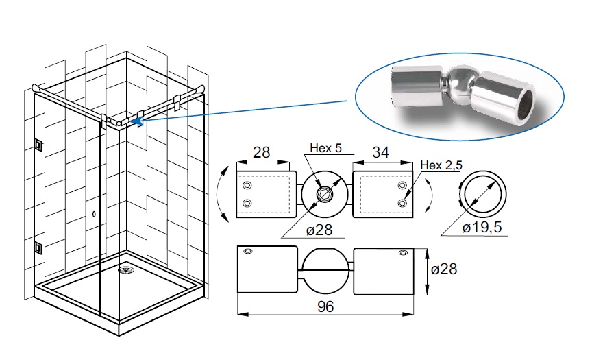 Swivel Connector F/2 Bars, F/ø19mm Tubes, Black Finish