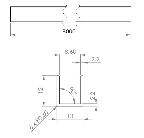 Alu. U-Channel, F/8mm Glass, Pol. Alu, 3,0 Mtr, 2,2x12x13mm (T/H/W)