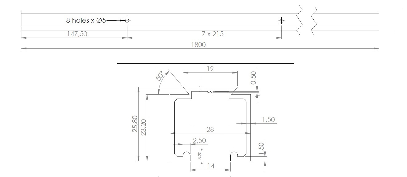 Alu Profile-Milled,28x25,8x1800mm, F/Sliding System K1002, W/8 Screw Holes ø5mm