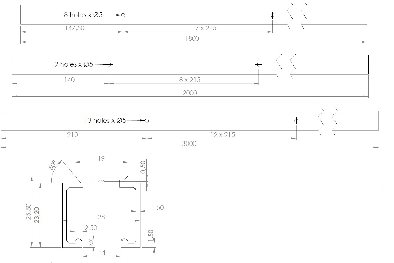 Alu Profile-Milled,28x25,8x2000mm, F/Sliding System K1002, W/9 Screw Holes ø5mm