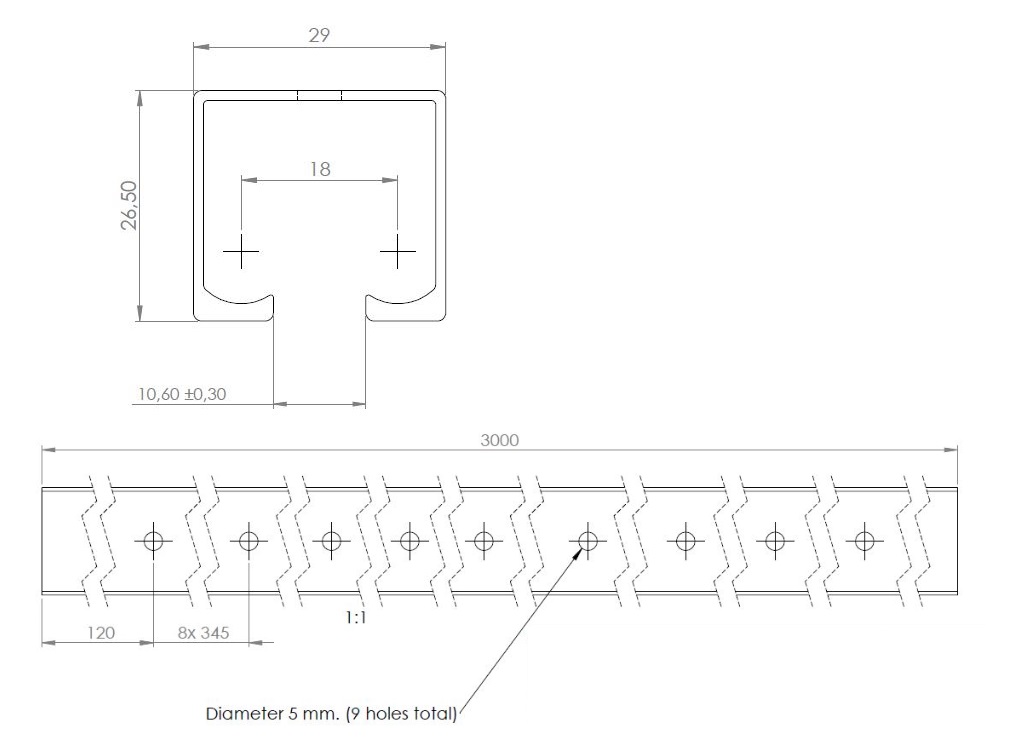 Alu Profile-Milled, 29x26,5x3000mm, F/Sliding System L1001 W/9 Screw Holes ø5mm