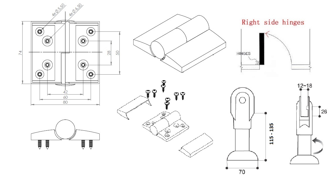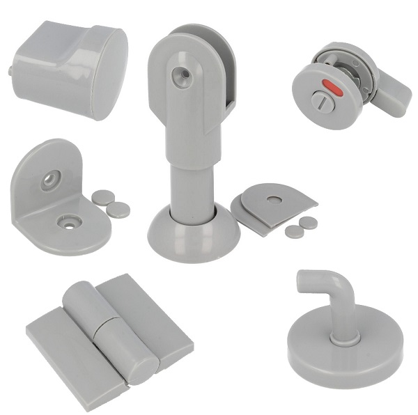 Toilet Cubicle Fit, Grey, PP, Right, Leg 115-135mm, Consist off 2 Handles, 1 Hook , 1 Lock, 12 Angle Brackets, 2 Hinges & 2 Stands, F/12-18mm Panels, F/Right Hand Doors