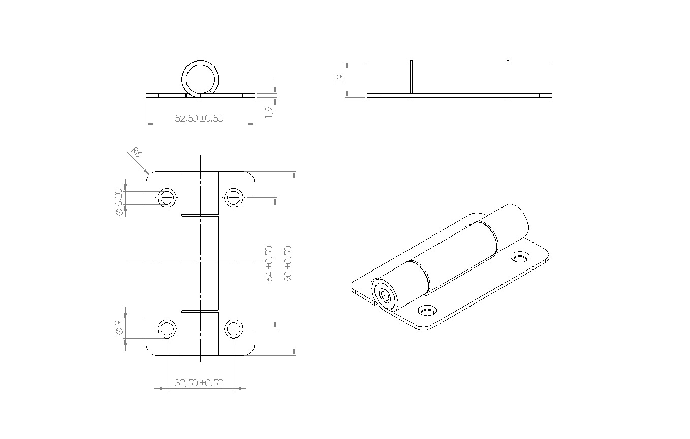 Door Hinge 90x52x2mm, No Spring Function, SS304 Brushed