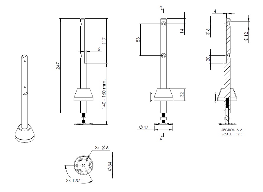Panel Support Leg 140-160mm, F/Panels from 6mm, SS304, For Toilet Cubicle, Screws & Nuts to be ordered Seperately (Item 22.23.147-5)