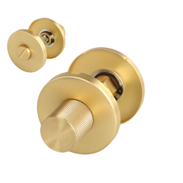 Thumbturn & Release "House" Brushed Brass, SS-304, W/O Indicator F/38-45mm Doors, CC:27mm Mounting Plate, 2 Pcs. Cut Off Screws M4x60mm + 2 Pcs. Sleeve Nuts M4x16mm, 1 Pcs 5x5x65mm Spindle, 1 Pcs 8x8x65mm Spindle