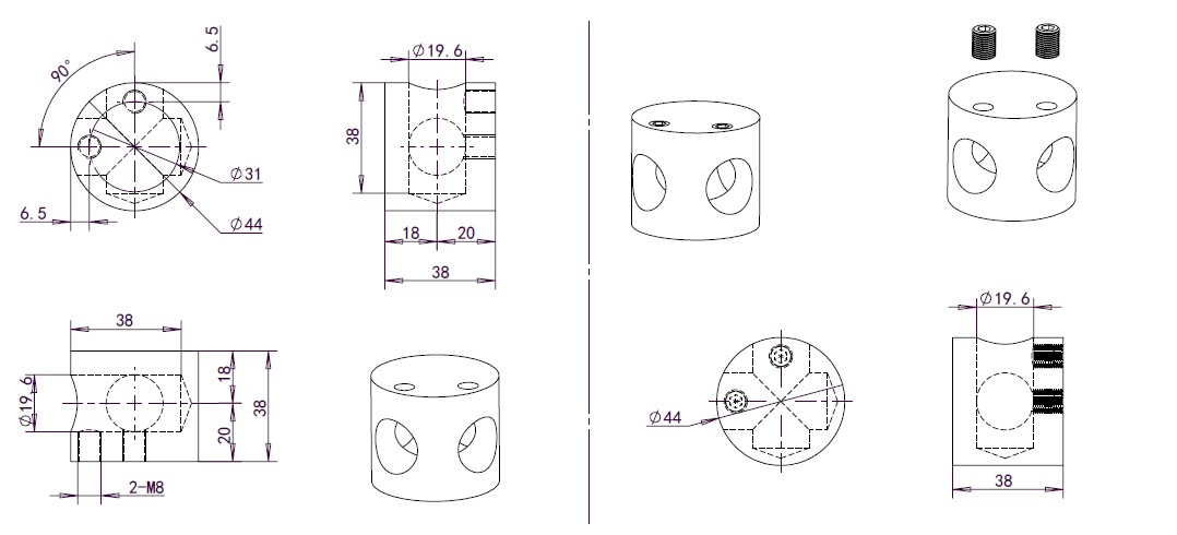 Tube Connector 2-Way, ø44x38mm, SS-304, Black Finish, F/ø19 mm Tube, F/Toilet Cubicles