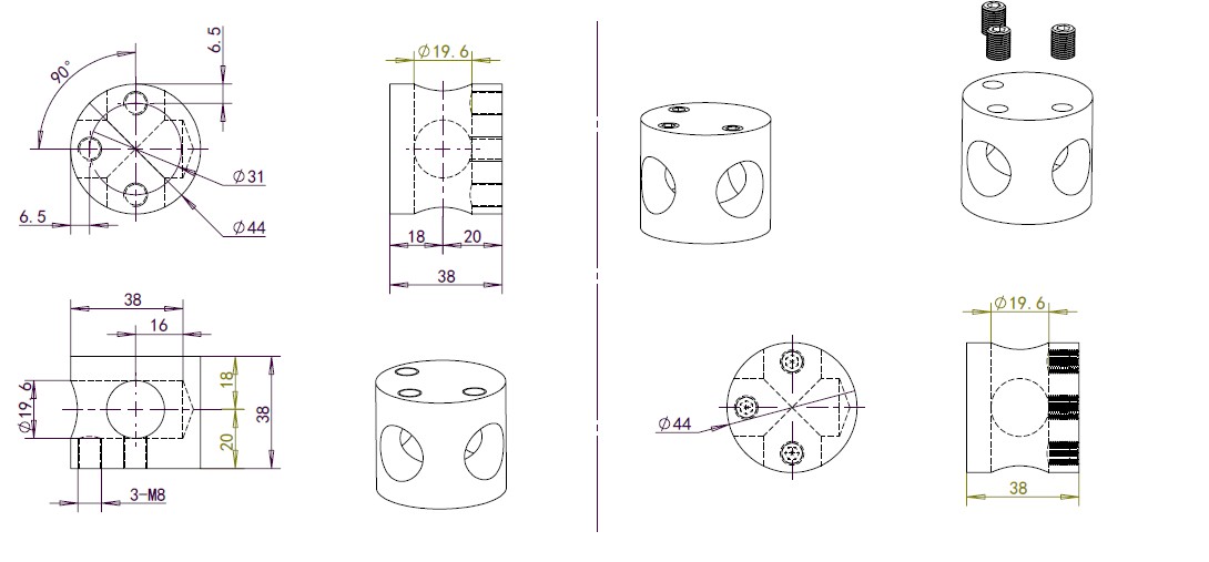 Tube Connector 3-Way, ø44x38mm, SS-304, Black Finish F/ø19mm Tube, F/Toilet Cubicles