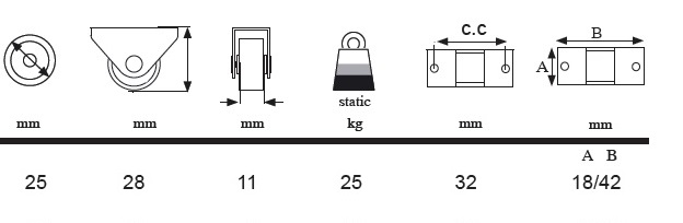 Box Castor ø25mm, 18x42mm Bracket, BZP, MH 28mm, Black PP