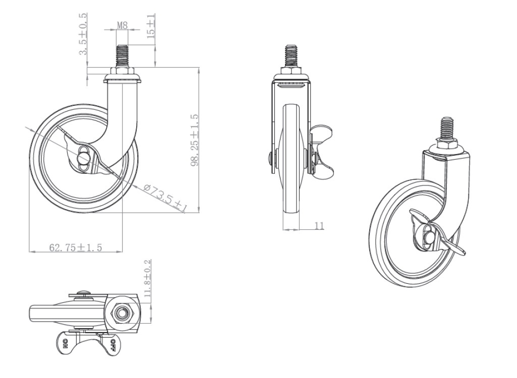 Tea Trolley Castor ø73,5mm "Tacitus", White, W/Brake & Stem M8x15mm, MH: 98mm, PA Track, Loading Capacity 12kg