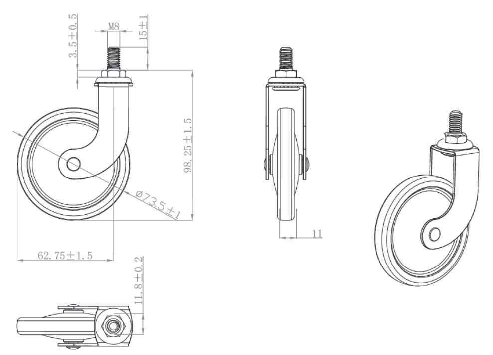 Tea Trolley Castor ø73,5mm "Tacitus", White, W/Stem M8x15mm, MH: 98mm, PA Track, Loading Capacity 12kg
