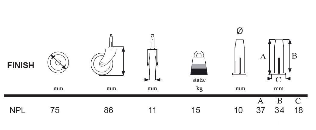 Tea Trolley Castor ø75mm "Titus", NPL, W/Metal Pin ø7 x 35mm & Black Plastic Bushing ø10 x 30 mm
