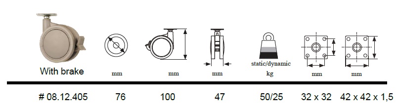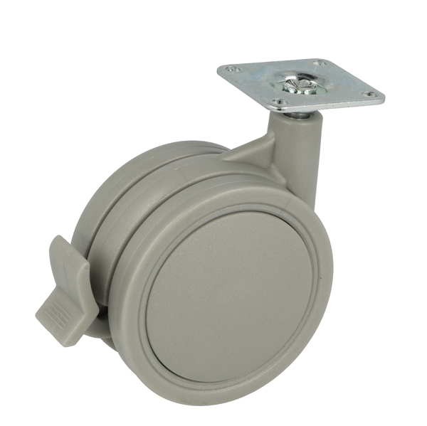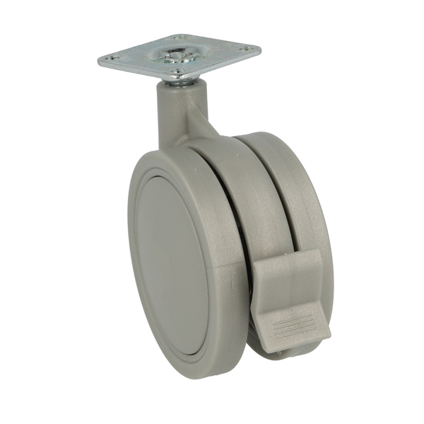 Twin Wheel Castor "Garda" ø76mm, Grey PP, W/Brake, W/PL 42x 42mm, cc:32x32mm, Mounthing Height: 100mm, Dynamic Load Capacity: 25Kg, Static Load Capacity: 50Kg