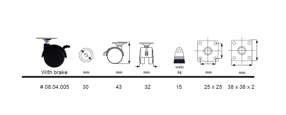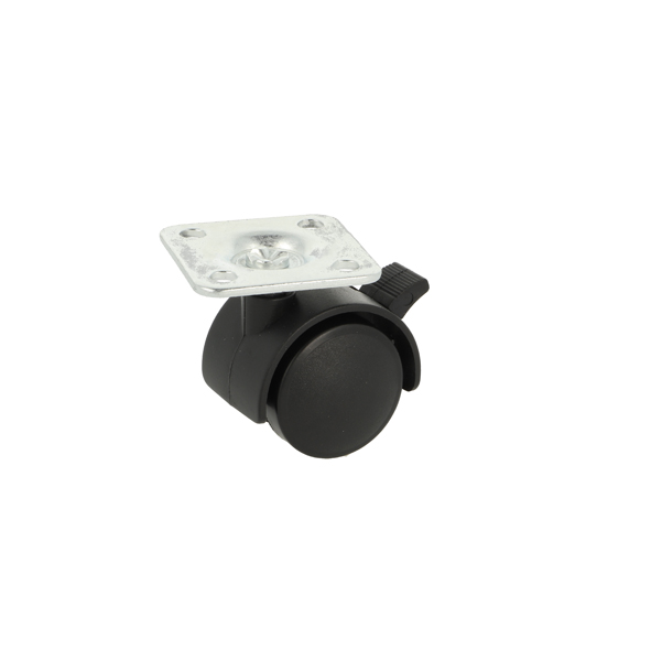 Twin Wheel Castor ø30mm, BLK. PA, W/Brake, Top Pl 38x38x2mm, Mounting Height: 43mm