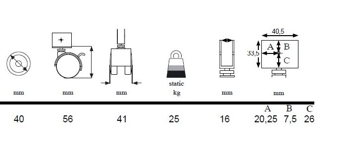 Twin Wheel Castor ø40mm, BLK, W/Brake, W/U-Bracket, F/16mm Mounting Height 56mm