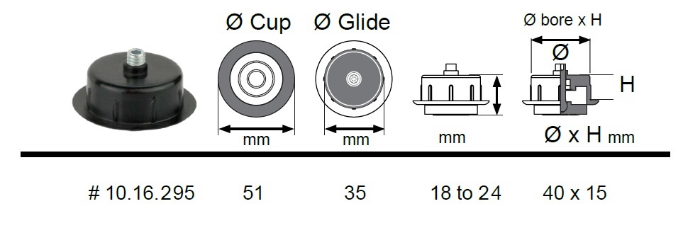 Mortise Leveller ø40x15mm,W/Adj.Glide ø35mm,BLK,Stud M8x20mm