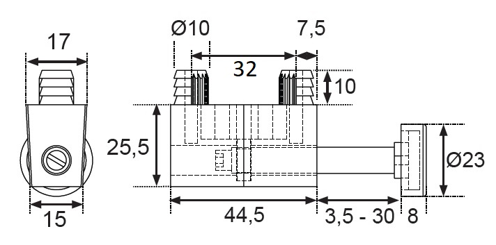 Knock-In Panel Adjuster, W/ø23mm Glide, Black,M8x70mm Stud W/Hex nut & PZD in the Top. Knock-in Pins ø10x10mm, cc:32mm