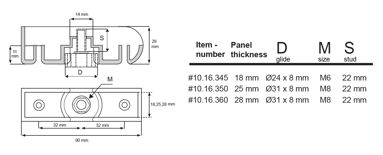 Panel Shoe W/Adjust. Glide ø31mm,BLK, Stud M8x22mm, F/25mm Panel
