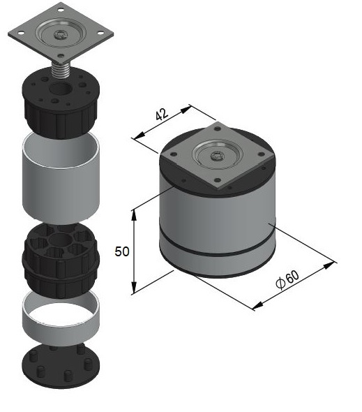 Alu Leg Jaco ø60mm, H 50mm PL 42x42x2mm, cc 32x32mm Stem: M10X27mm ,Silver Sprayed Finish