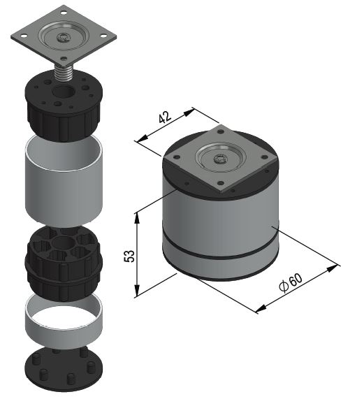 Alu Leg Jaco ø60mm, H 58mm PL 42x42x2mm, cc 32x32mm Stem: M10X27mm ,Silver Sprayed Finish