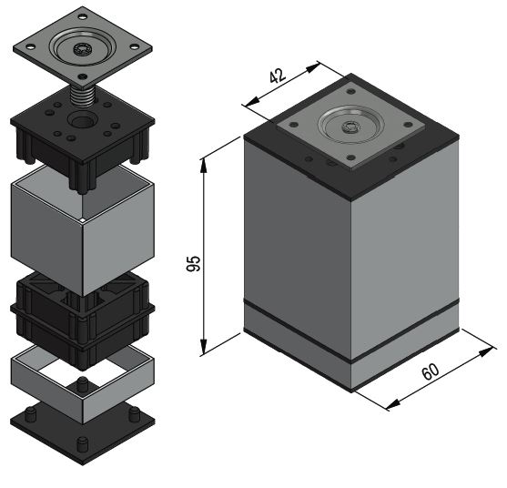 Alu Leg Niko 60x60mm, Polished, 100mm, PL 42x42mm,cc 32x32mm