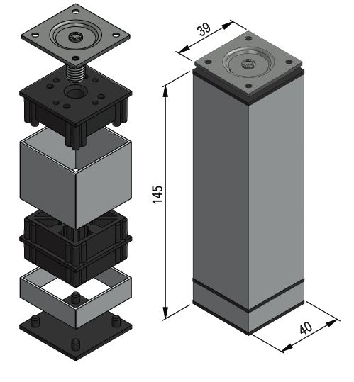 Black Alu Leg Niko 40x40mm, H 150mm, PL 39x39x2mm,cc 29x29mm Stem: M10X27mm ,Black Anodized Finish