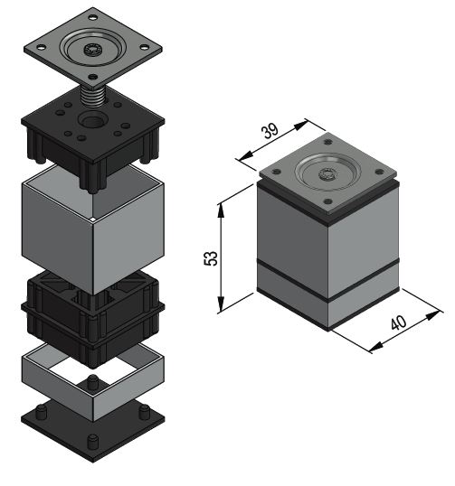 Black Alu Leg Niko 40x40mm, H 58mm PL 39x39x2mm, cc 29x29mm Stem: M10X27mm ,Black Anodized Finish