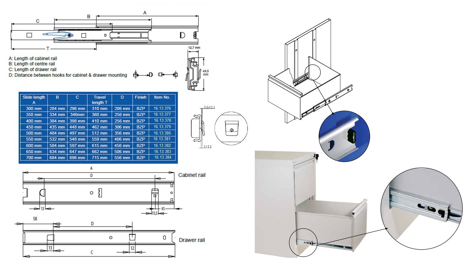Drawer Slide ME4950, 500mm, Hooks w/Locking Knob, BZP, F/ Metal Cabinets, Hook Distance: 356mm