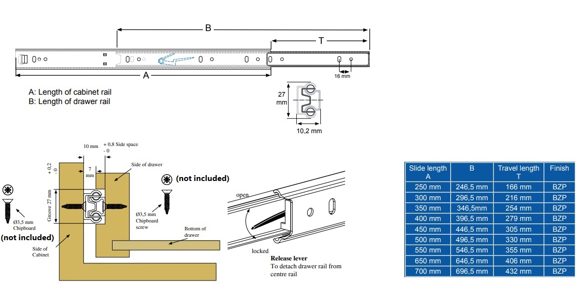 Drawer Slide 8827, 250mm, W/Stop & Release, BZP