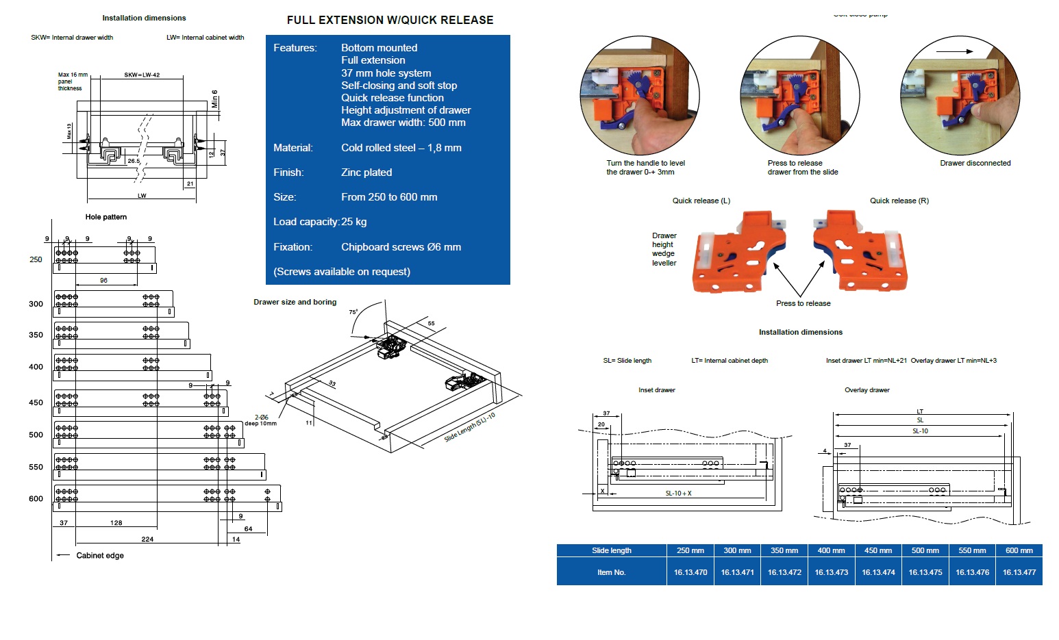 Invis. Full Ext. Slide, Self Closing, Pre-Zinc,300mm,W/Quick Release & Inner Dampers