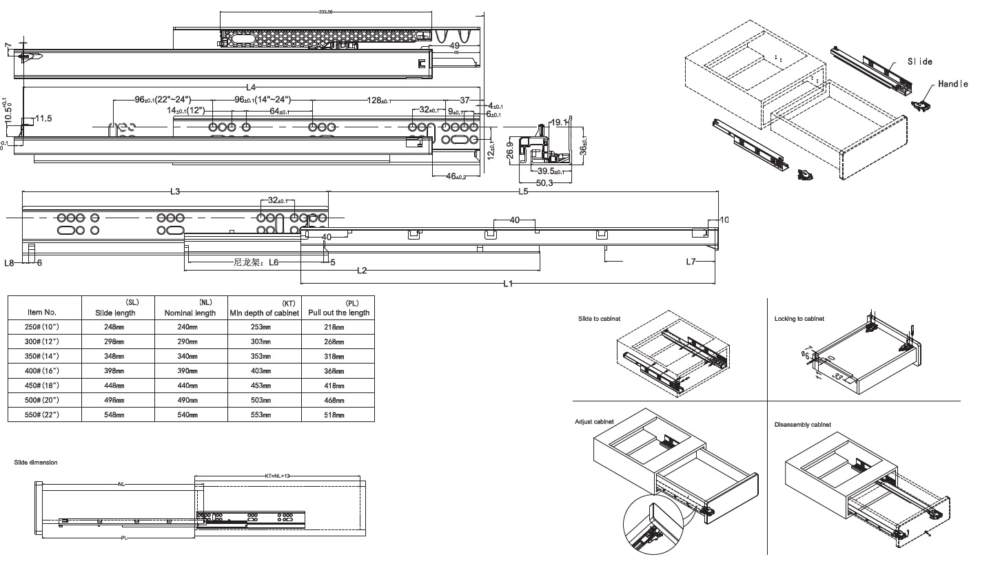 Invis. Full Ext. Slide, Self Closing, Pre-Zinc,400mm,W/Quick Release & Inner Dampers