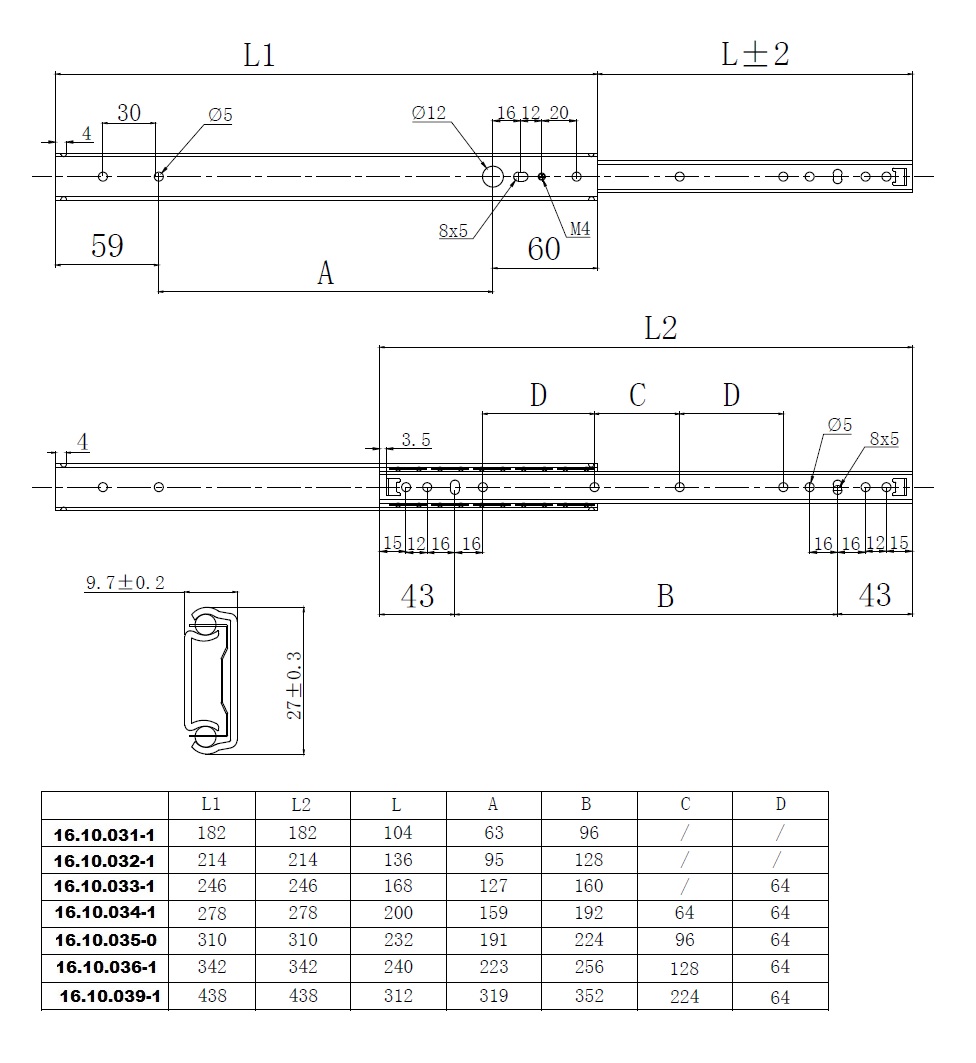 Drawer Slide 8827, 484mm Drawer, 1,0mm (278/278), ZP