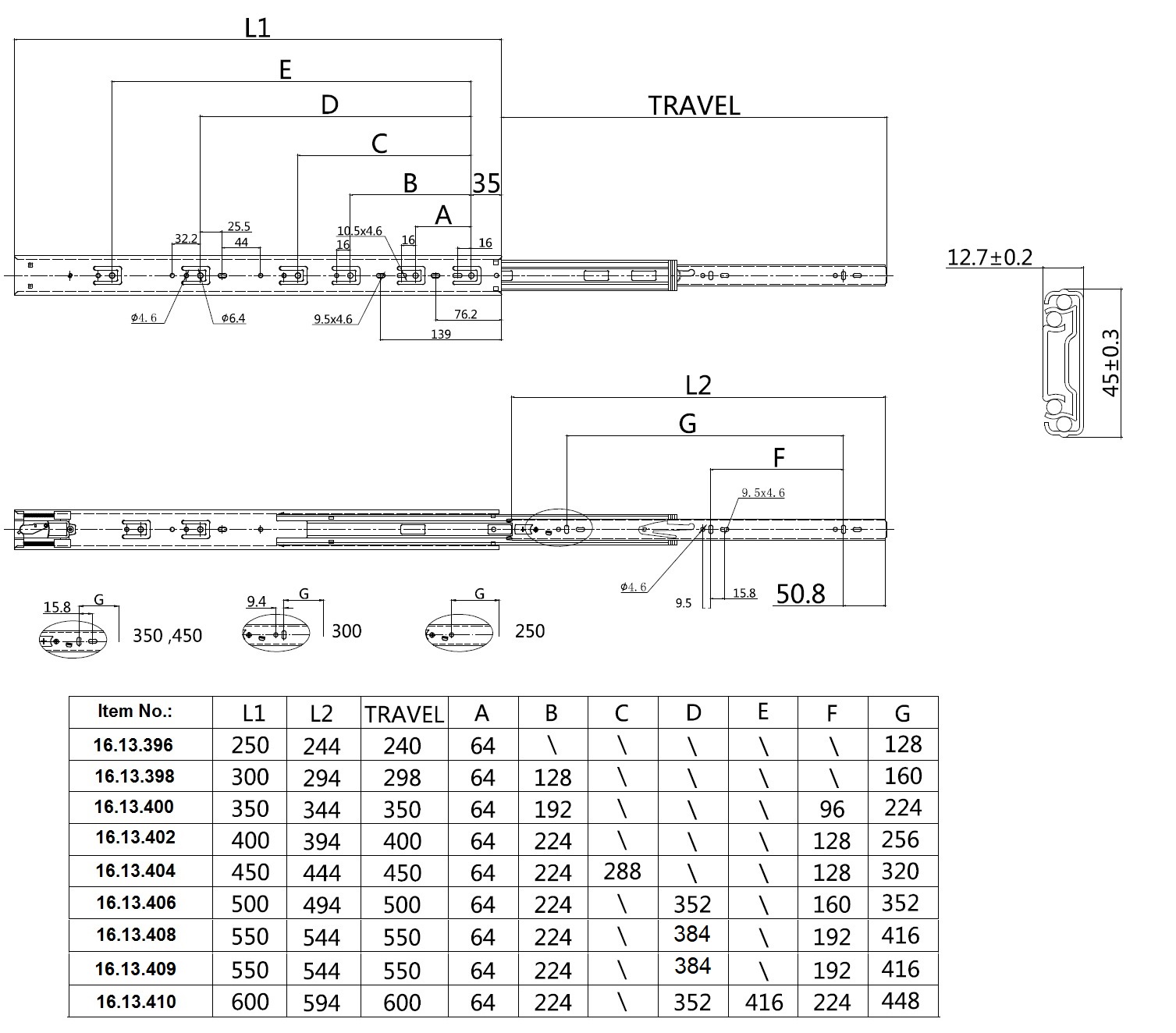 Drawer Slide PTO 4500, Full Extension, Black Zinc Pl., 550mm