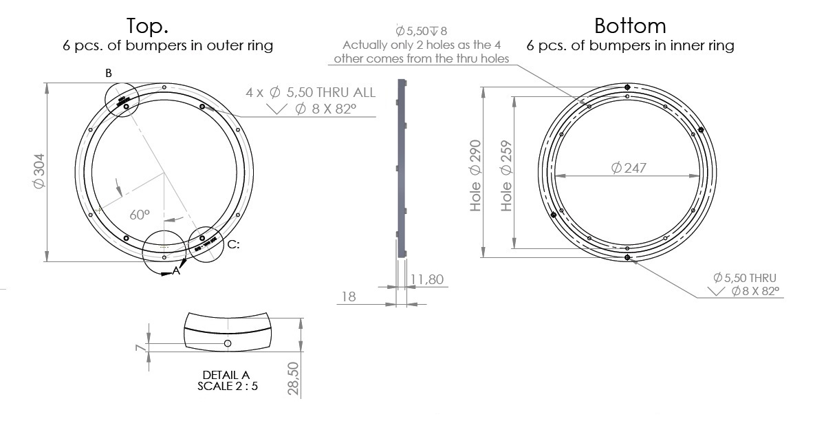 Lazy Susan Alu. Swivel, ø304x12mm, ID 247mm, ø6mm SS-Ball Bearing, Load Capacity: Max 70Kg, 4 CSK Holes, 6 White Rubbers ø10,2 x 3,3mm on each side