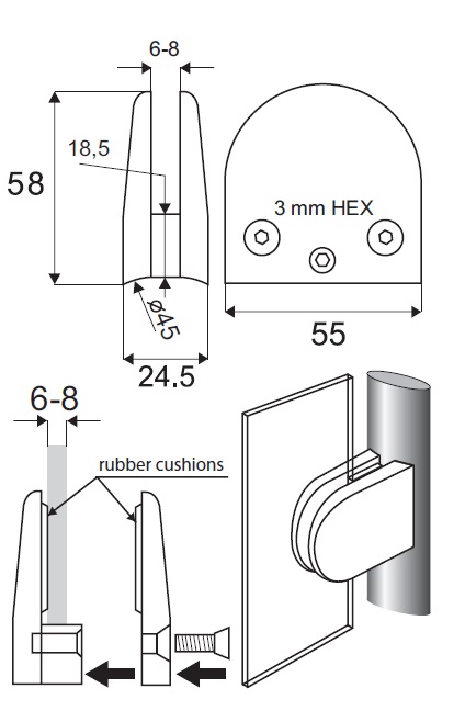 Glass Clamp, "Large", Zamak, CPL, Bent Tube ø45mm, F/6-8mm Glass Thickness