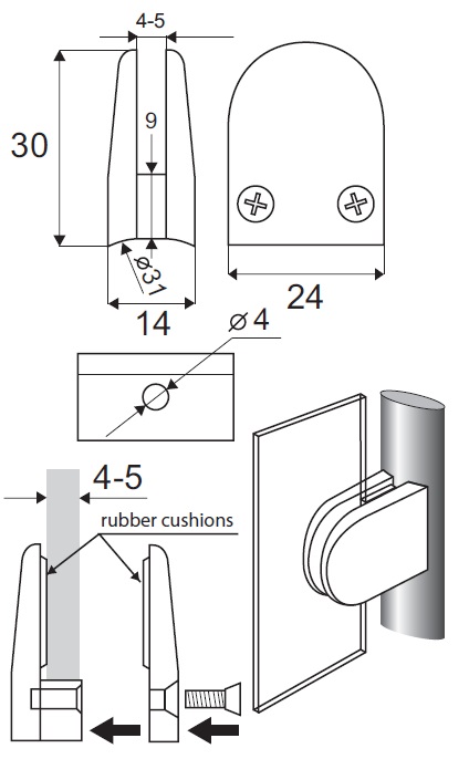 Glass Clamp, "Small", Zamak, CPL, Bent Tube ø31mm, F/4-5mm Glass Thickness