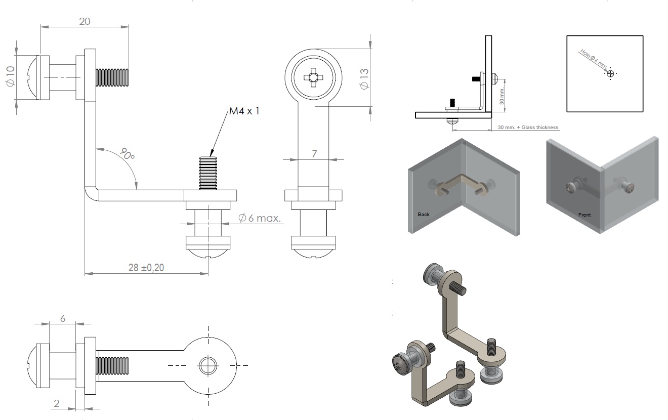 Glass/Glass Connector "Claw", 2-Way, Steel NPL 35x35mm, W/4 Transparent Washer & 2 Transparent Tubes & 2 BZP Screws M4x20mm