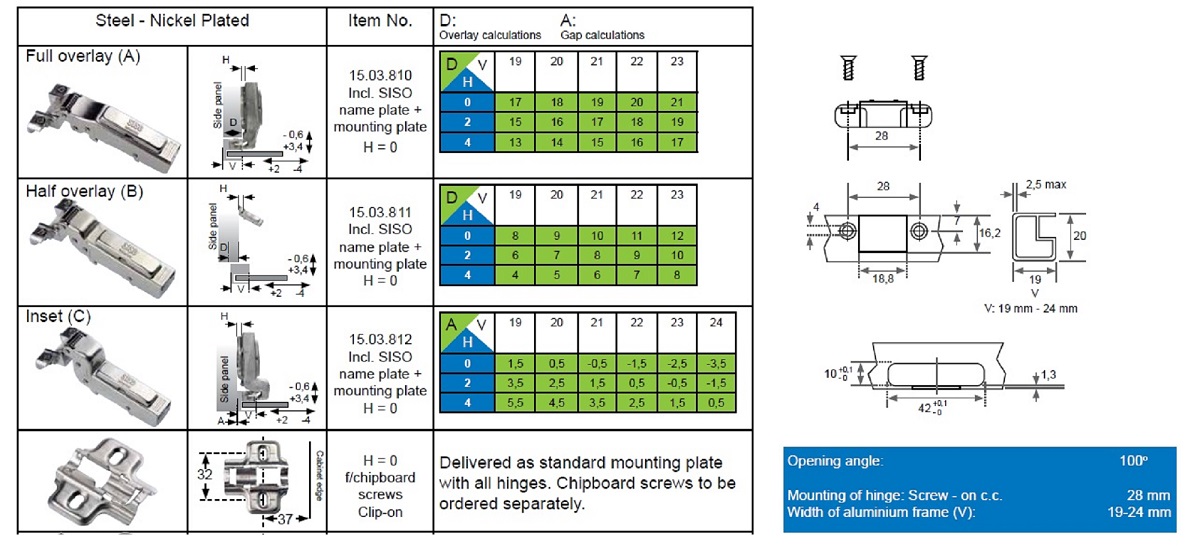 Alu Frame Hinge "C", Clip-On, 100DG, NPL, H=0, W/Plate F/ Wood Screws , Inset, W/SISO DK Name Plate, No Screws, F/19-24mm Alu Frames, cc:28mm On Hinge Head