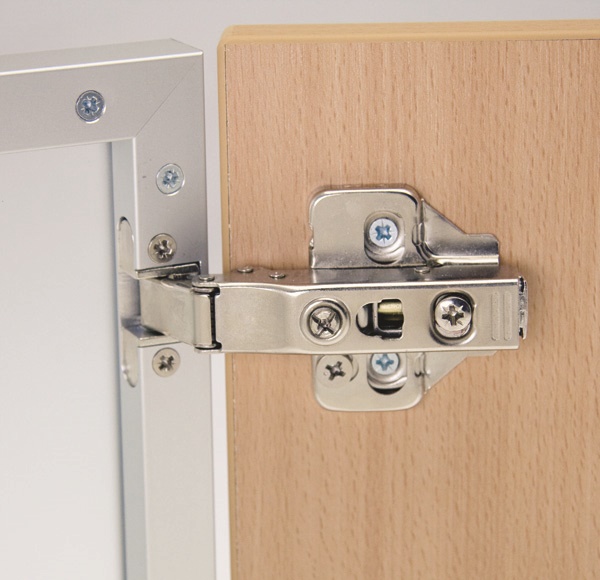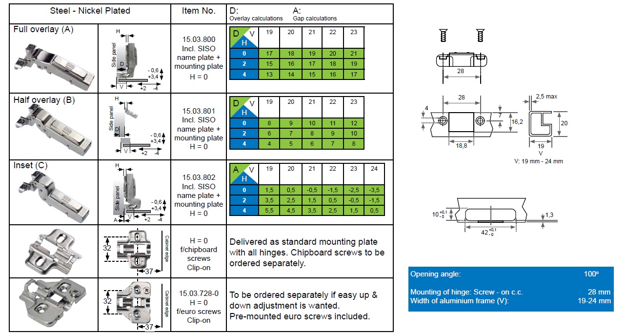 Soft Close Hinge F/Alu Frame "C", Clip-On, 100DG,H=0,W/Plate F/Wood Screws, Inset, W/SISO DK Name Plate,No Screws, F/19-24mm Alu Frames, cc.:28mm On Hinge Head