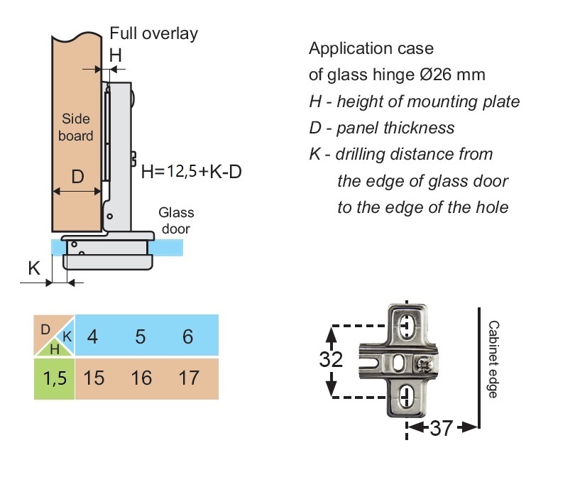 Glass Door Hinge "Mini" NPL/BLK,Full-Overlay,W/Plate F/Chip- board Screws, 95DG, 4-6mm Glass, ø26mm Drilling, Mounting Plate H=1,5, Slide-On, Front Cover To be ordered Seperately
