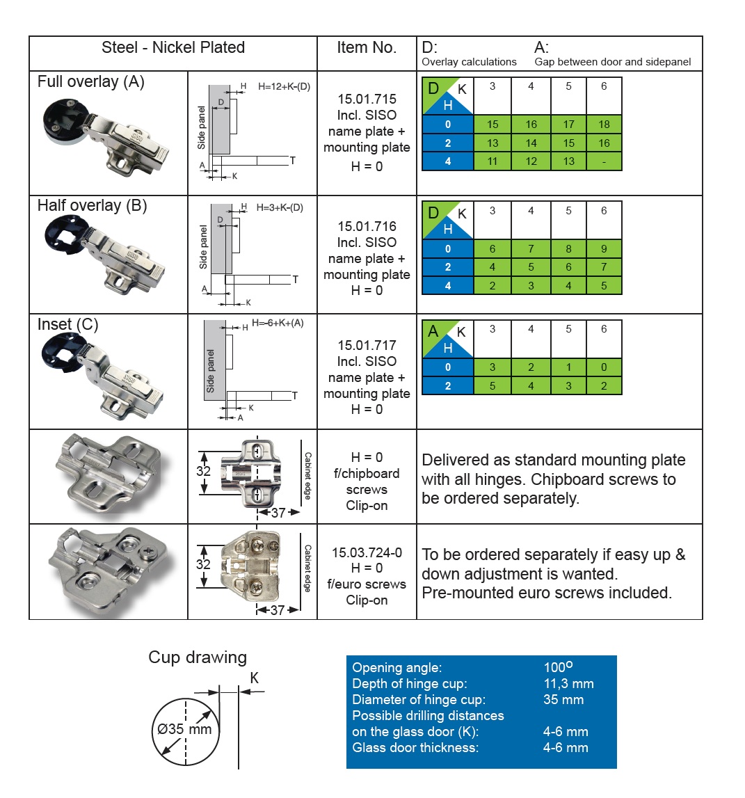 Maxi Glass Door Hinge, NPL, Inset, Soft Close, With Clip On Plate F/Chipboard Screws H=0, 100DG,Bore:ø35mm, W/SISO DK Name Plate, Excl. Cover Cap & Screws, 4-6mm Glass Thickness