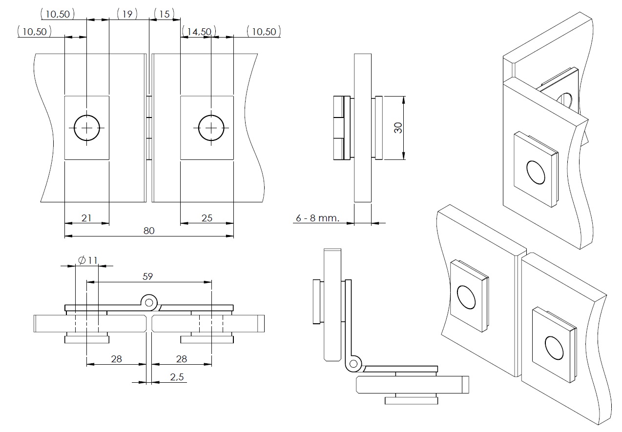 Glass Door Hinge "Bosch" 30x80mm, CPL, Glass/Glass, ø9mm Bore, 6-8mm Glass, 270 Opening, 3mm Brass Material, Max Door Weight 5 Kg Pr.Pair, Max Door Size 600x400mm (H/W)