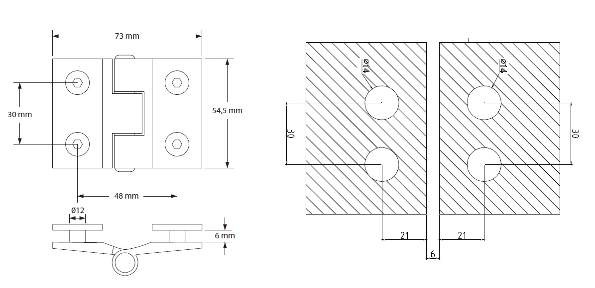 Glass Door Hinge "Sofia", Glass/Glass, 180DG, 6mm Glass Thickness, Drilling Required ø14mm, Rectangular Shape, Brass Material