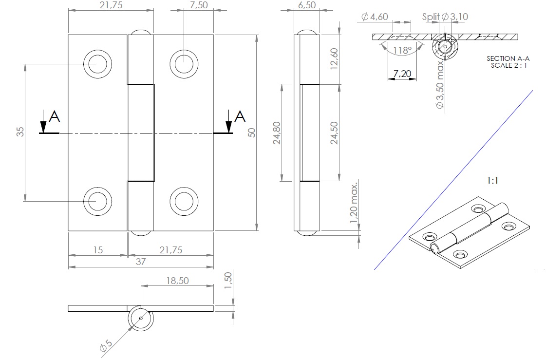 Butt Hinge, 50x37x1,5mm, Steel, BPL, 4 CSK Holes
