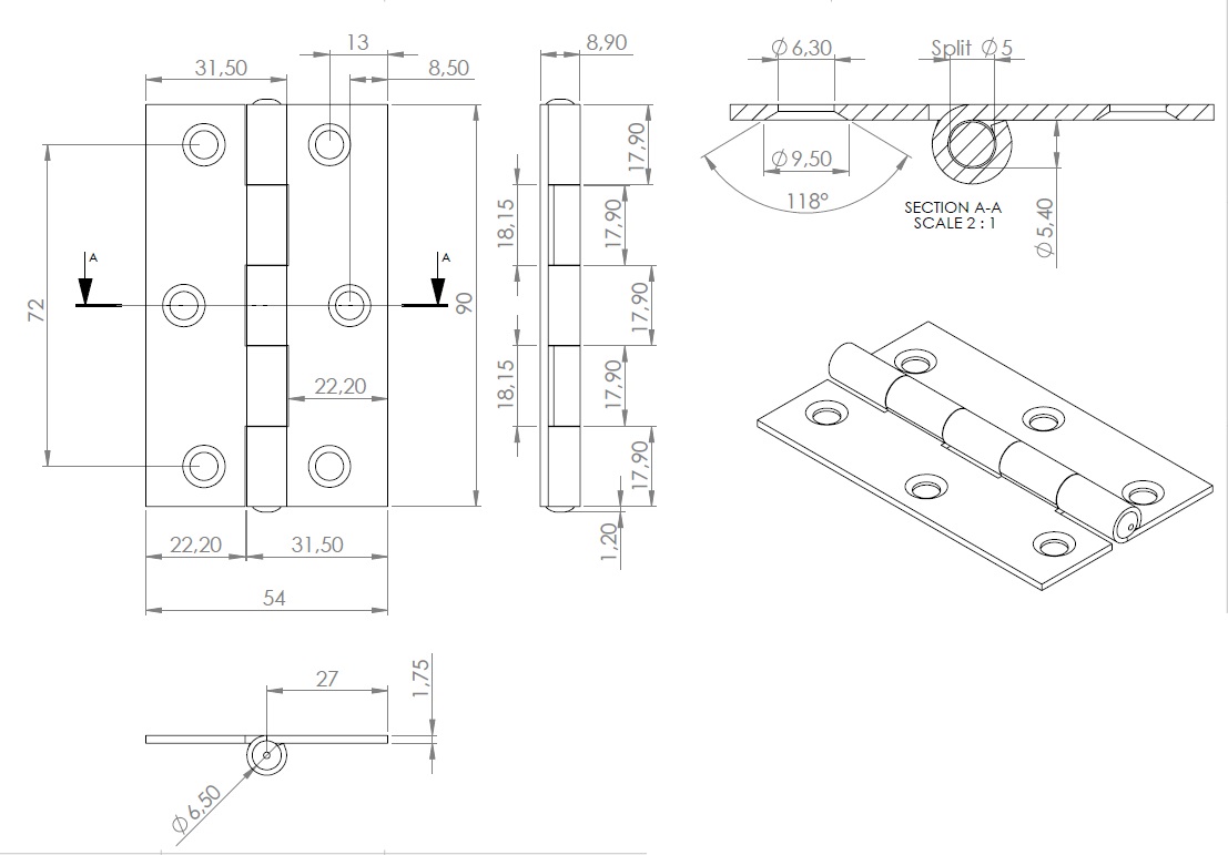 Butt Hinge, 90x54x1,75mm, Steel, BPL, 6 CSK Holes