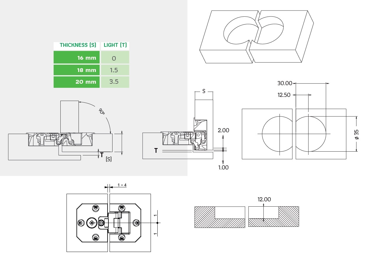 Flap Hinge ø35x12mm, Zamak, Black, W/Cover Plates,Detachable From 16mm Panel Thickness, Hidden Screws