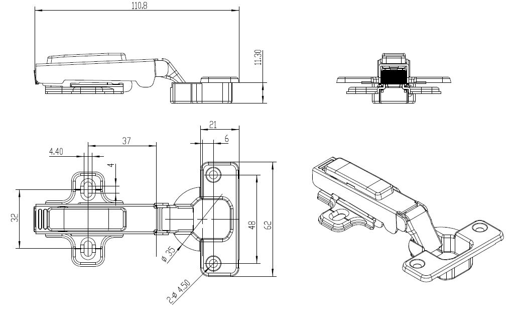 Maxi Hinge "A", Clip-On, 100DG, NPL, ø35mm, H=0, W/Plate F/ Wood Screws, Cup: cc:48mm, Full-Overlay, W/SISO Name Plate, Can Be Used Together With 15.03.731-3