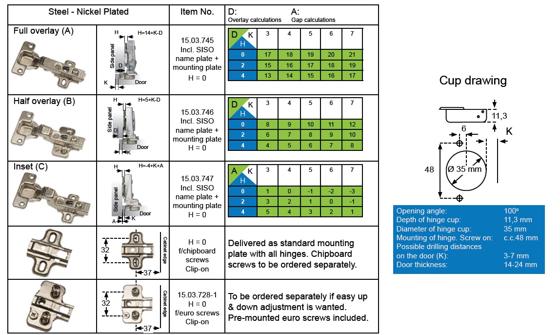 Maxi Hinge "PTO" , Clip-On, 110DG, NPL,Inset,W/Plate F/Chip- board Screws,H=0mm, Cup: cc:48mm, W/SISO Name Plate, Perfect To Be Used With Touch/Spring Latches