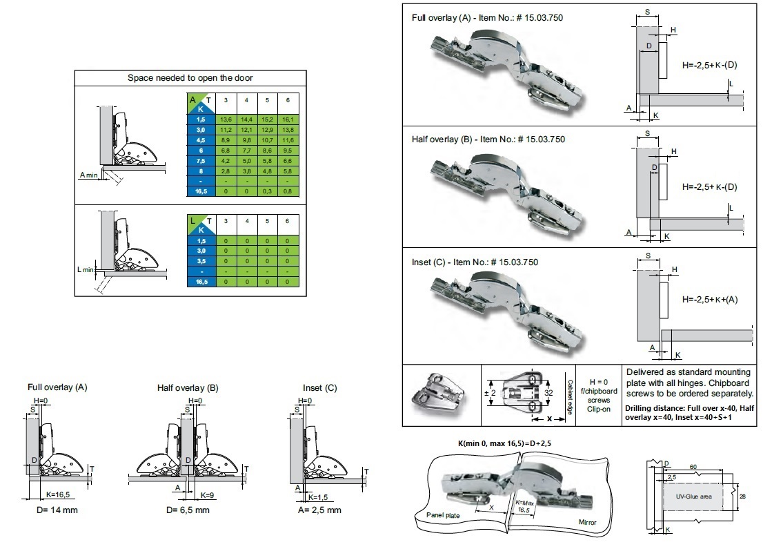 Soft Close "Mirror" Hinge,Clip-On, 125DG,NPL,Universal,F/UV- Glue, Mounting Plate F/Wood Screws, H:0mm, Hydraulic Plastic Pump, 3-6mm Glass Thickness, Max Load Capacity: 8 KG