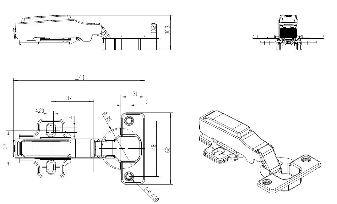 Soft Closing Hinge "B",ø35mm,Clip-On,H=0,Plate F/Euro Screws Half-Overlay, 100 Degree, Cup cc.:48mm,Mounting Plate F/Euro Screws, H:0mm,W/SISO Name Plate,Hydraulic Plastic Pump
